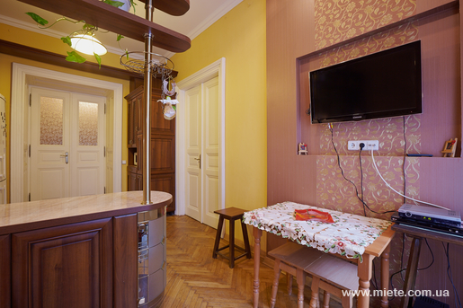 Двокімнатна квартира, австрійський люкс за адресою вул. Паркова, 14 (елітний район). Загальна площа 54 кв.м. У квартирі велике двоспальне ліжко з ортопедичним матрацом + двомісний диван. Квартира біля входу в Стрийський парк (біля озера), висока стеля, відреставрована австрійська столярка, двофункційний котел, індивідуальне опалення, підігрів підлоги в коридорі та ванній, нові меблі, нова сантехніка, місце для стоянки автомобіля перед вікнами, парадний вхід, інтернет, цифрове т/б, дизайнерський ремонт, нова (дорога) побутова техніка (газова плита, пральна машина, холодильник, мікрохвильова піч, плазмовий телевізор, фен, праска, DVD програвач).
